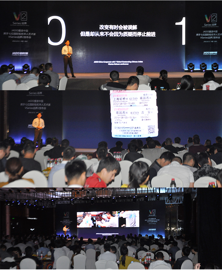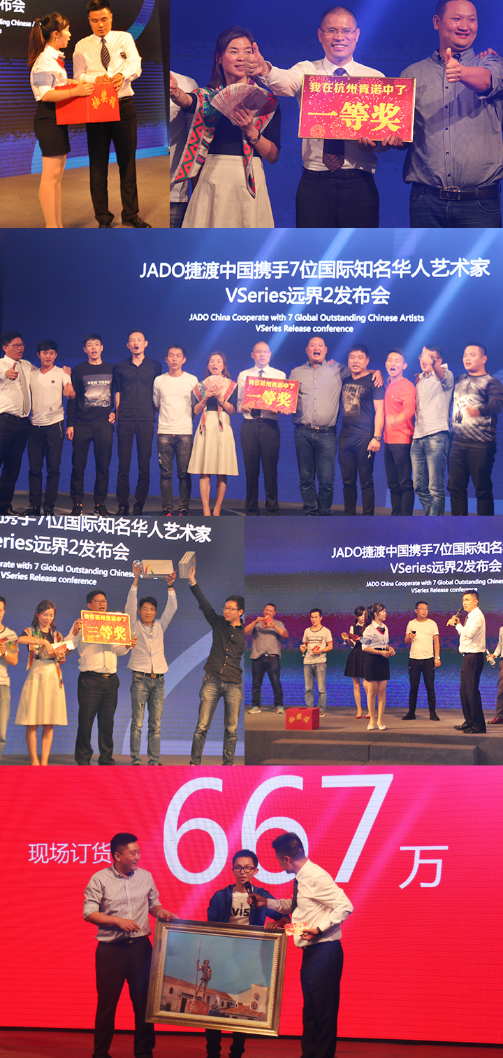 2016年10月11日,以 “再見,過去;你好,遠界 Bye yesterday, Hello VSeries” 為主題的“JADO捷渡中國攜手七位國際知名華人藝術家VSeries遠界2(中國• 杭州)發布會”在杭州海外海國際酒店完美落幕。本次活動由JADO捷渡中國浙江省戰略伙伴杭州肯諾汽車用品有限公司主辦。