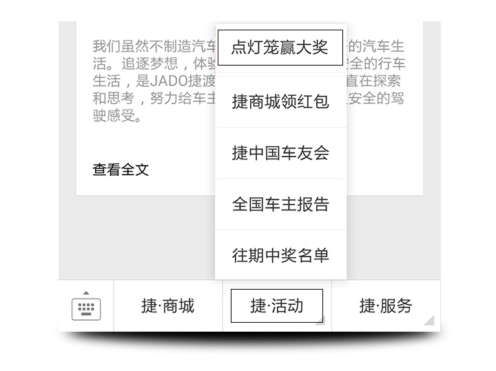JADO捷渡中國 官方微信商城代金券一張 【參與方式】 請關注并打開公眾號捷渡中國 回復關鍵詞燈籠參與活動 也可以點擊捷渡中國公眾號菜單鍵 捷·活動—點燈籠贏大獎參與活動
